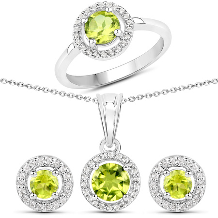 Naturalny perydot: Ilość/Waga: 2/1.60 ct i 2/0.48 ct, Kształt/Wielkość: 2/Okrągły/ 6 mm i 2/Okrągły/4 mmNaturalny kryształ górski: Ilość/Waga: 80/0.64 ct, Kształt/Wielkość: Okrągły/1.10 mmWielkość wisiorka: ok. 18x10 mmWielkość kolczyków: ok. 7 mmDługość łańcuszka: ok. 45 cmWielkość korony pierścionka: : ok. 10 mmRozmiar: 17