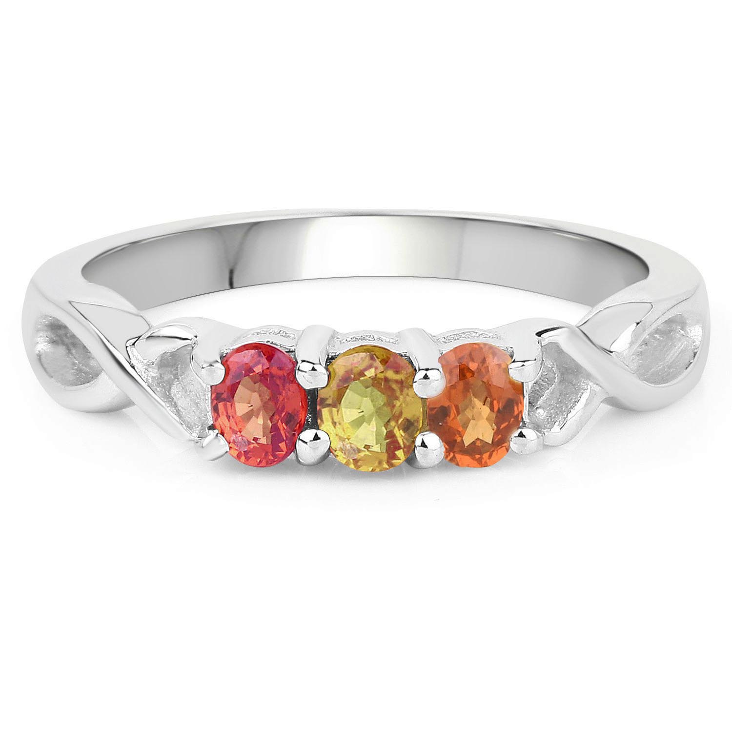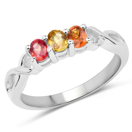 Gustowny srebrny pierścionek z naturalnymi szafirami: żółtym, pomarańczowym i czerwonym. Wykonany ze srebra rodowanego próby 925.