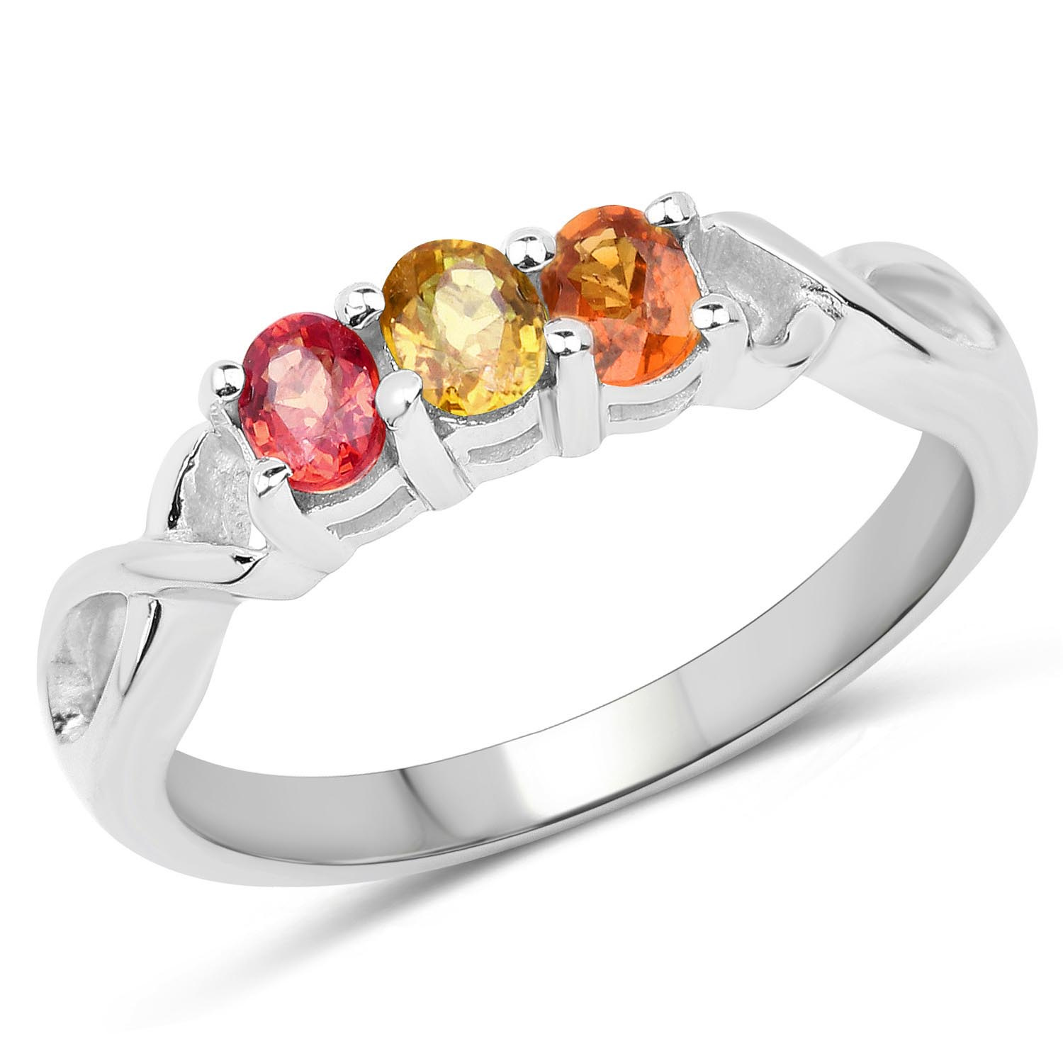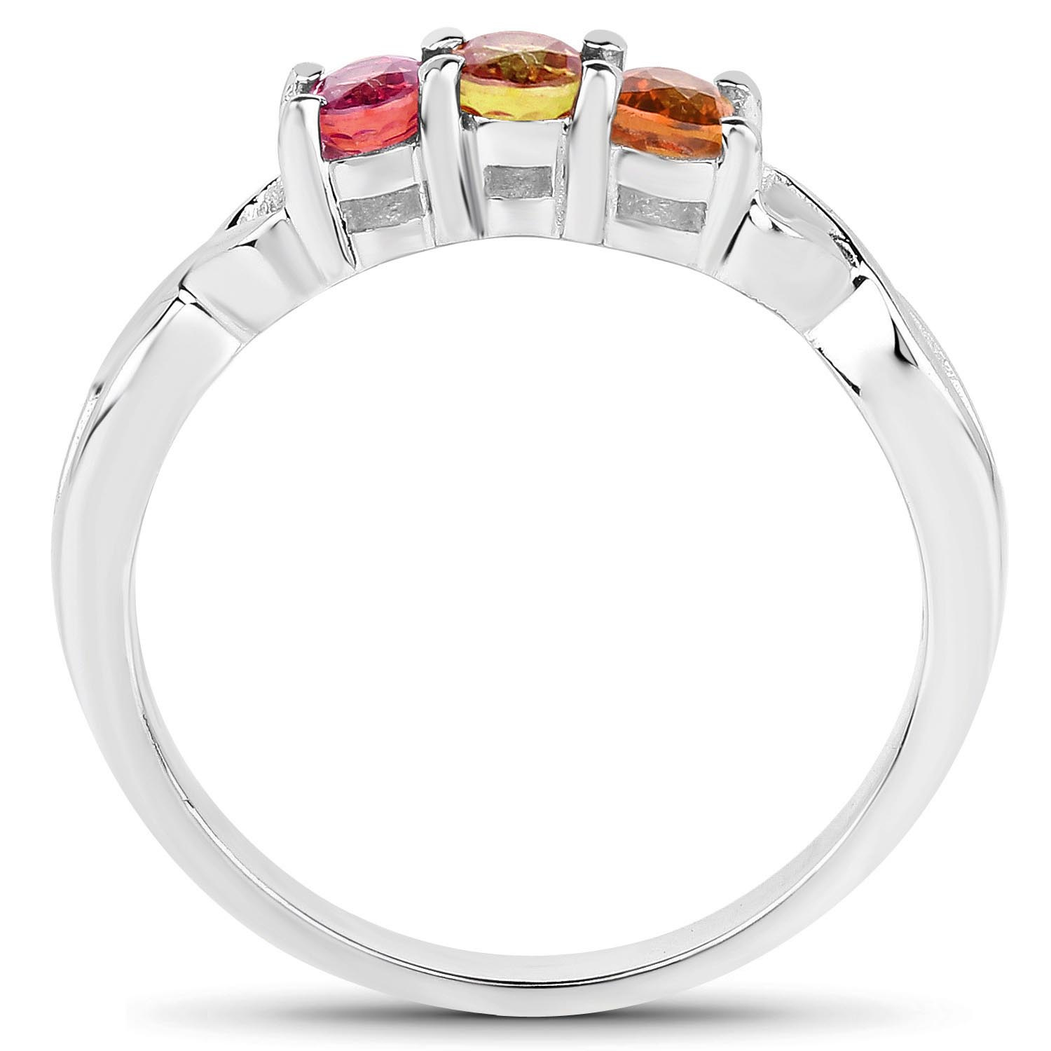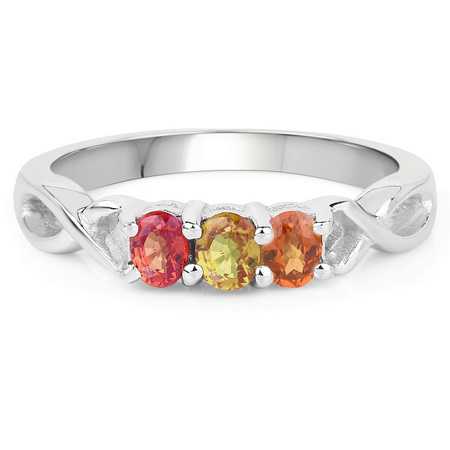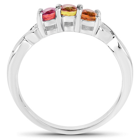 Naturalny szafir żółty: Ilość/Waga: 1/0.20 ct, Kształt/Wielkość: Owalny/4x3 mmNaturalny szafir pomarańczowy: Ilość/Waga: 1/0.20 ct, Kształt/Wielkość: Owalny/4x3 mmNaturalny szafir czerwony: Ilość/Waga: 1/0.20 ct, Kształt/Wielkość: Owalny/4x3 mmWielkość korony pierścionka: ok. 11x4 mm