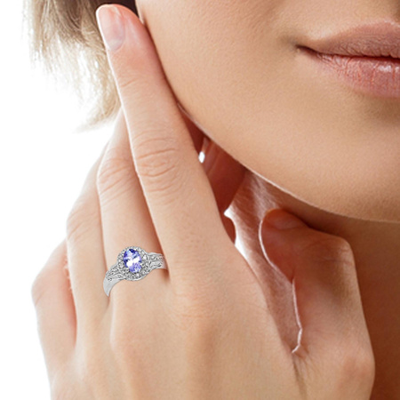 Naturalny tanzanit: Ilość/Waga: 1/0.75 ct, Kształt/Wielkość: Owal/7x5 mmNaturalny diament : Ilość/Waga: 6/0.03 ct, Kształt/Wielkość: Okrągły/1 mmWielkość korony pierścionka: ok. 18x10 mmWłaściwości kamieni
