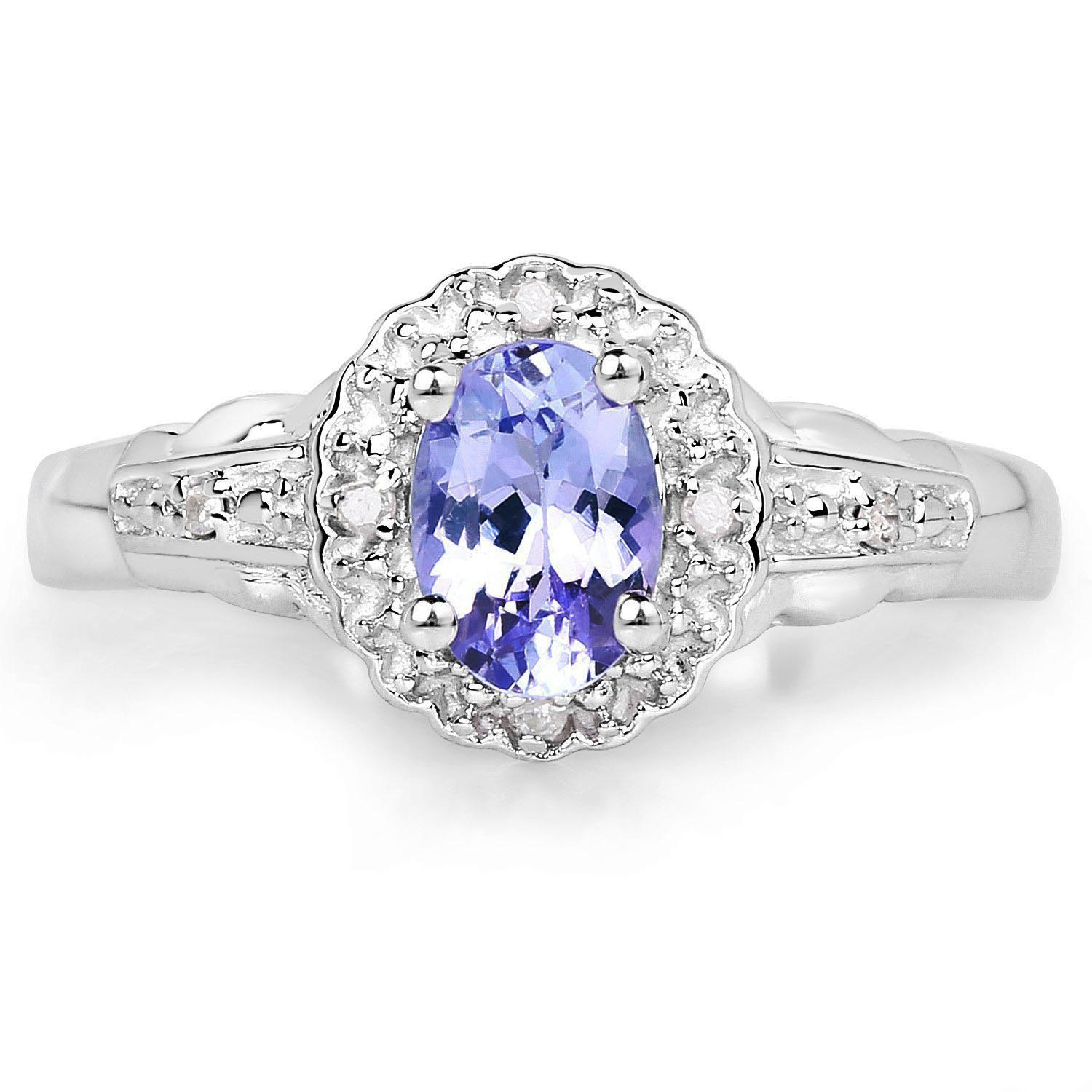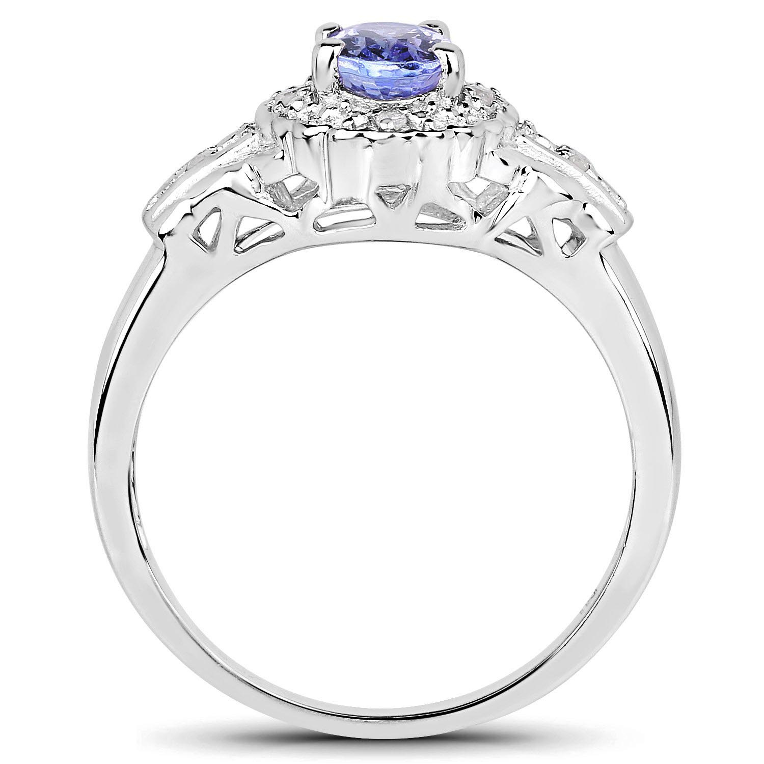 Majestatyczny srebrny pierścionek z rodowanego srebra próby 925 z tanzanitem w pięknym kolorze, otoczonym wianuszkiem diamentów.