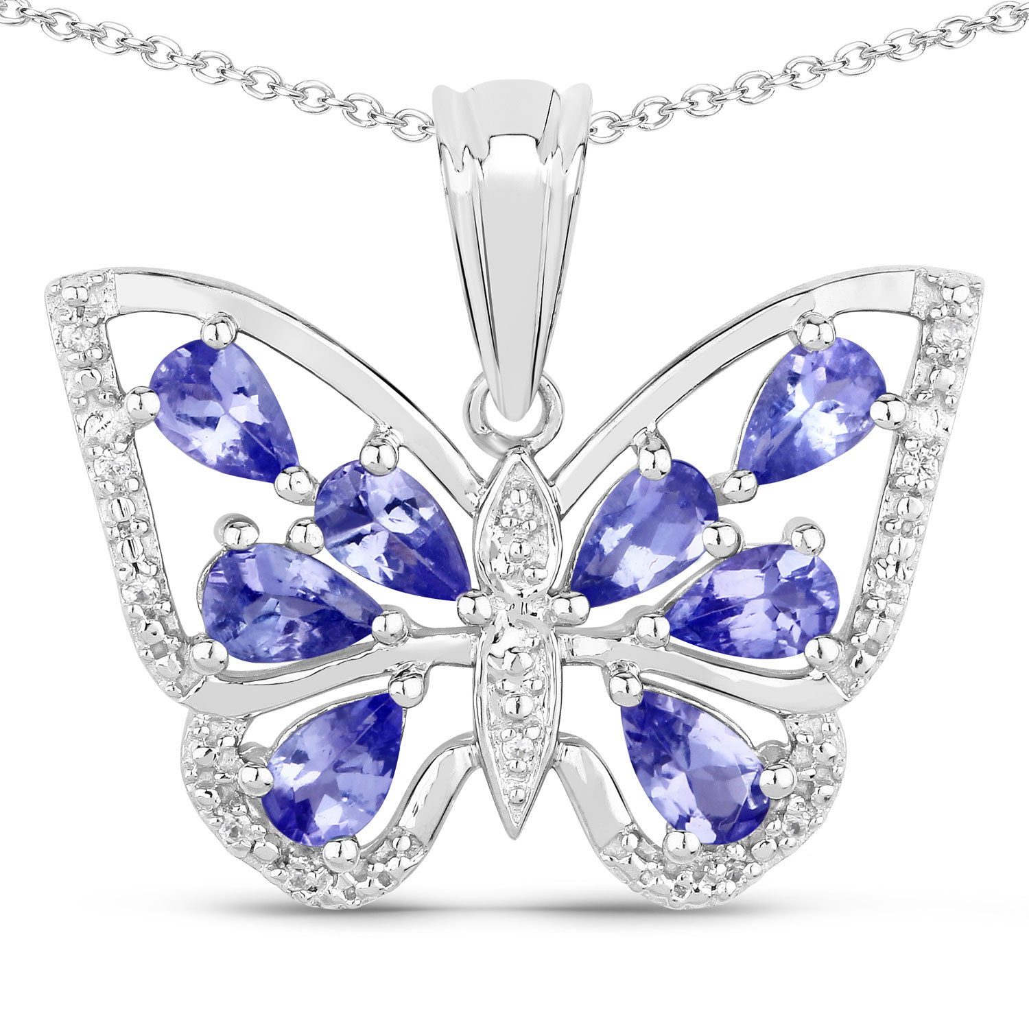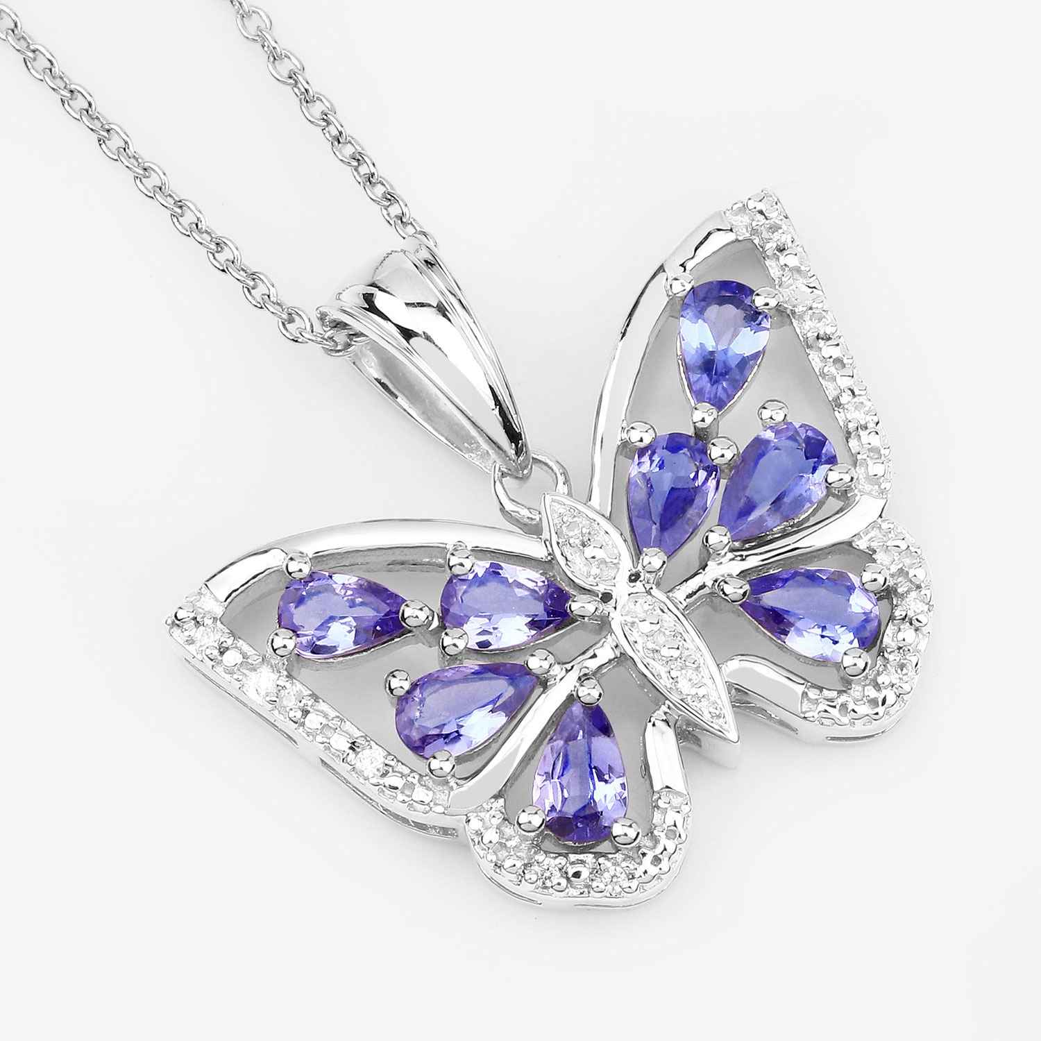Romantyczny wisiorek w kształcie motyla wykonany z rodowanego srebra próby 925, wysadzany naturalnymi tanzanitami oraz cyrkoniami.
