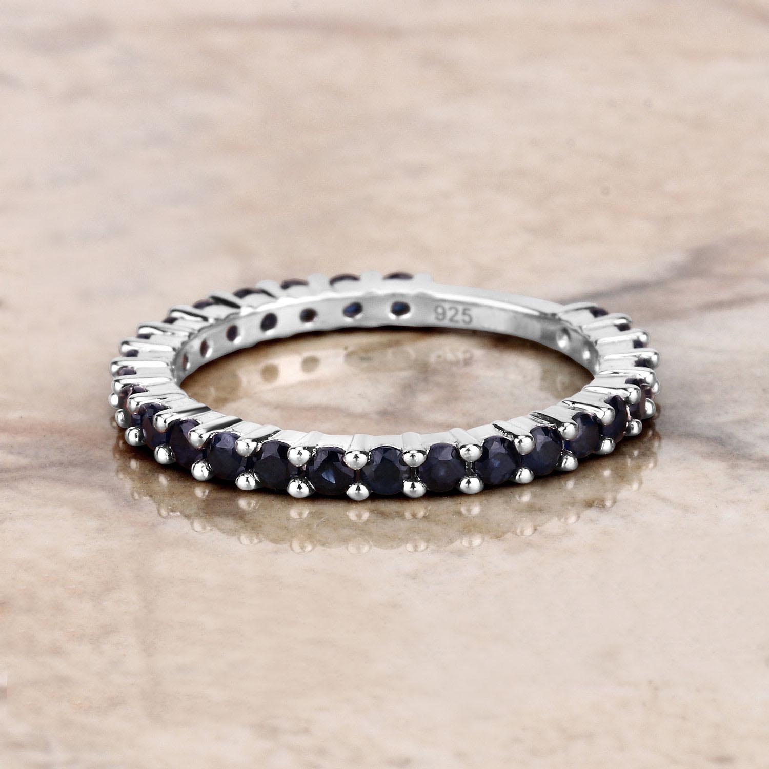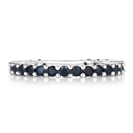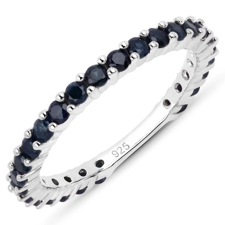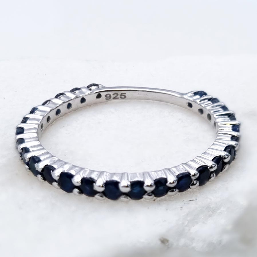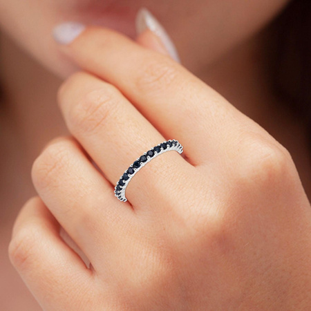 Srebrny pierścionek obrączka z 24 naturalnymi cejlońskimi szafirami, pięknie kontrastującymi z rodowanym srebrem próby 925.