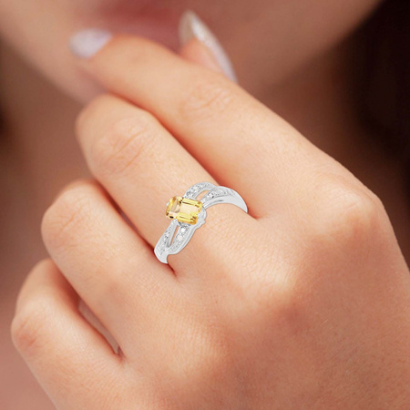 Przykuwający uwagę srebrny pierścionek z naturalnym cytrynem o przepięknej barwie oraz diamentami, wykonany z błyszczącego rodowanego srebra próby 925.