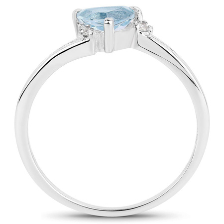 Skromny srebrny pierścionek z naturalnym brazylijskim topazem niebieskim i diamentami, osadzonymi w rodowanym srebrze najwyższej próby 925.
